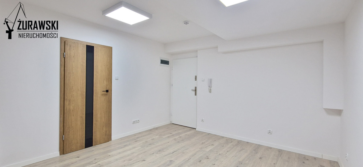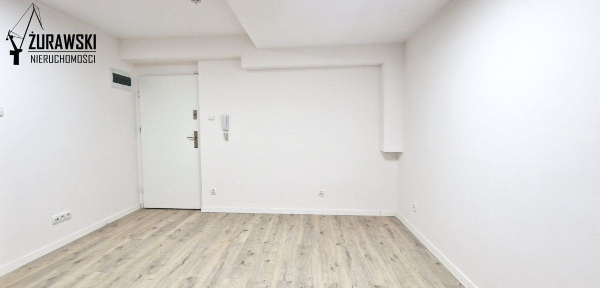 Lokal o powierzchni 21 m² obejmuje ustawne pomieszczenie główne, aneks kuchenny oraz łazienkę.