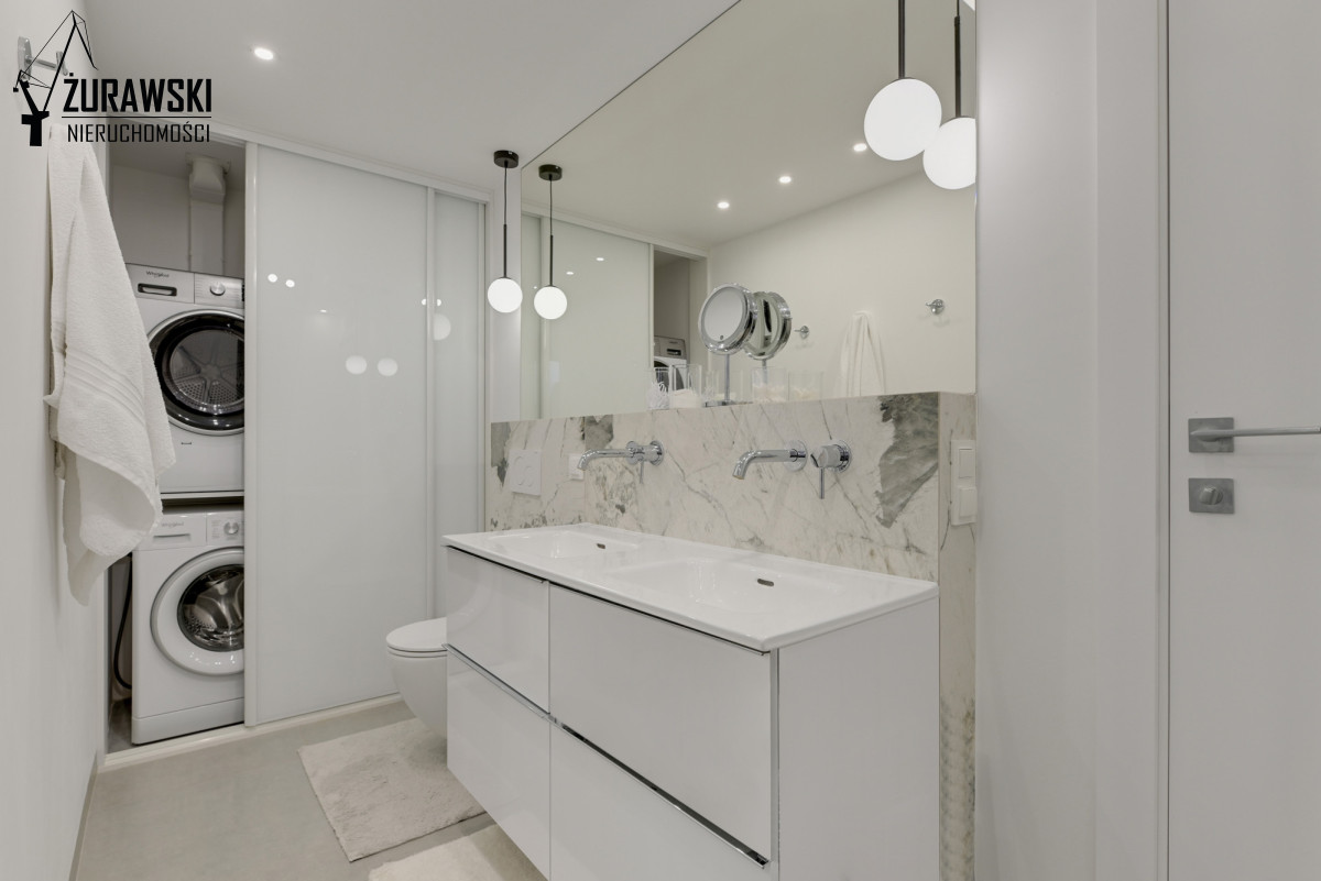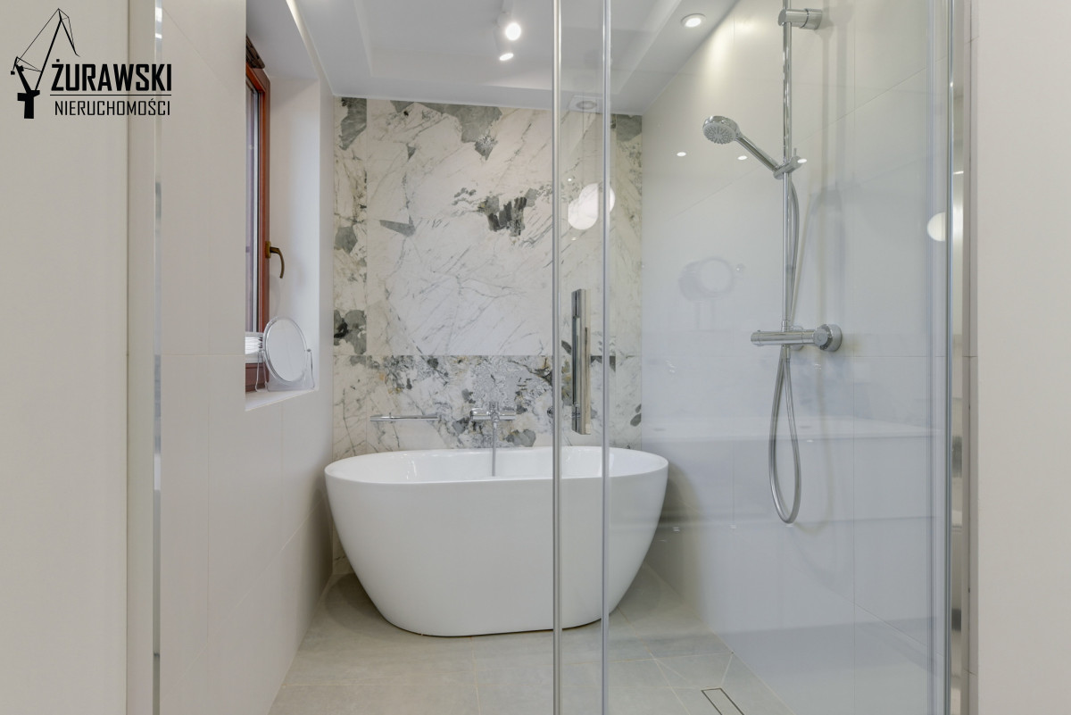 - łazienka z wanną i prysznicem oraz zabudową z pralką i suszarką